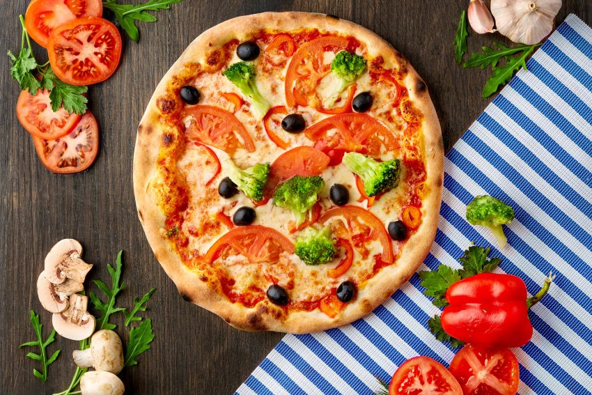 Соус томатний, оливкова олія, сир моцарелла, перець болгарський, помідори, броколі, оливки чорні.