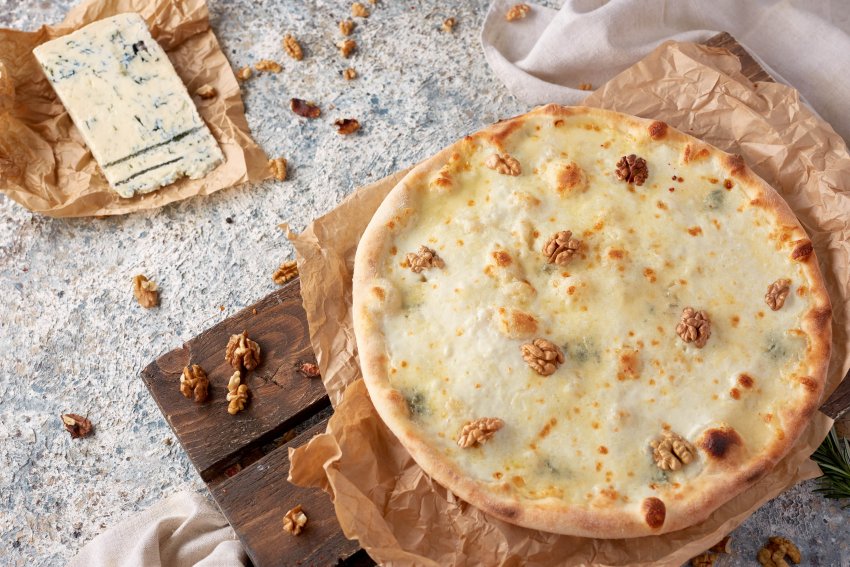 Вершковий соус,сир моцарелла, едемер,горгонзола,пармезан, грецький горіх, шинка та сирний бортик.