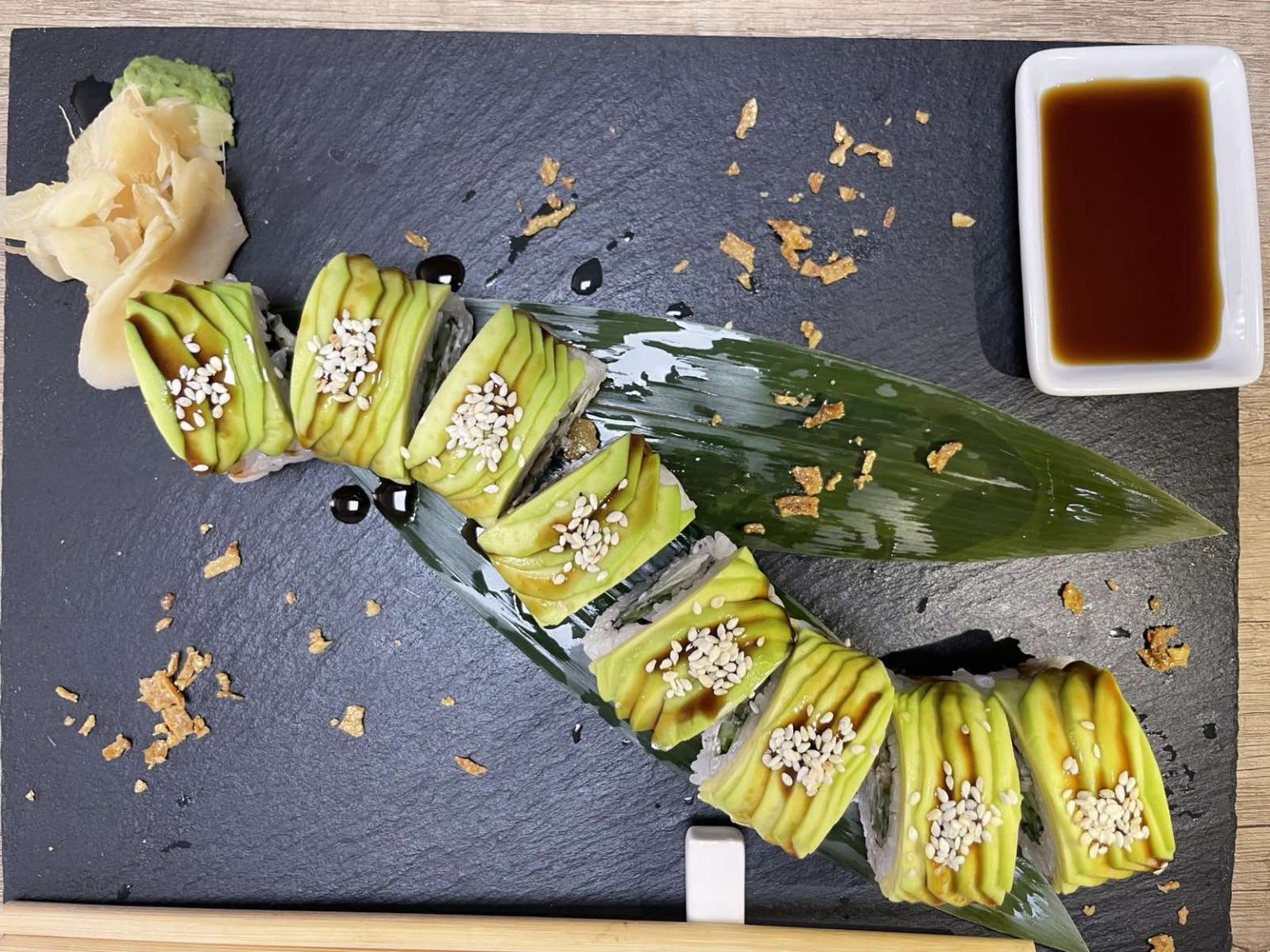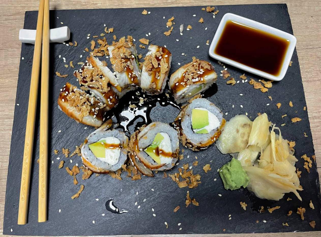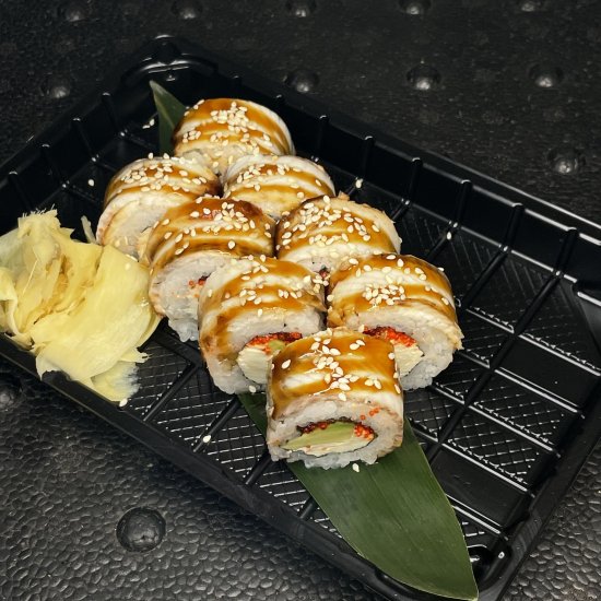 Рим, норі, крем сир, авокадо, тобіко, вугорь, унагі, кранч, конжут Вага 280гр