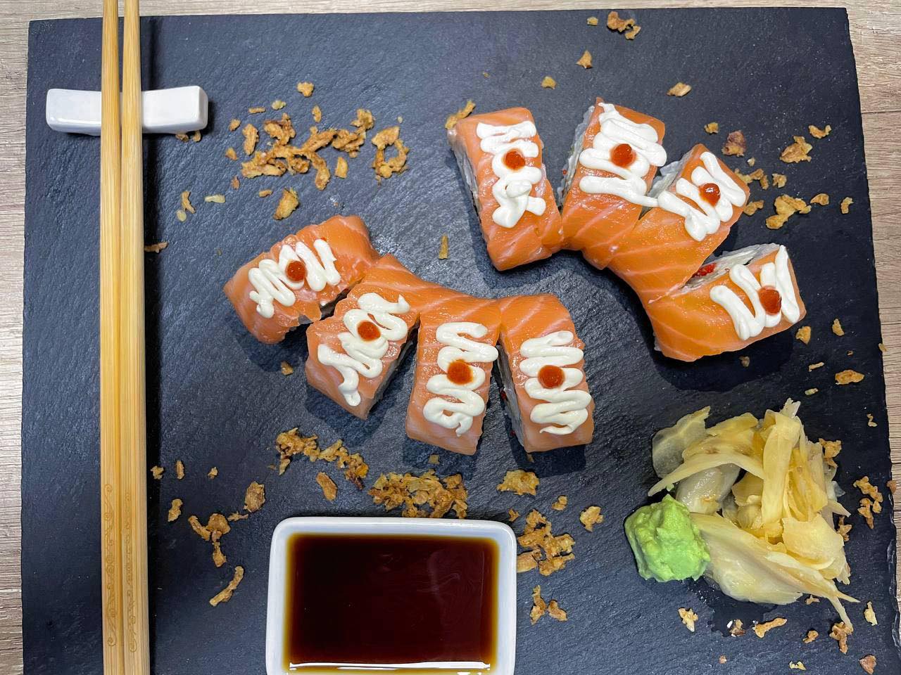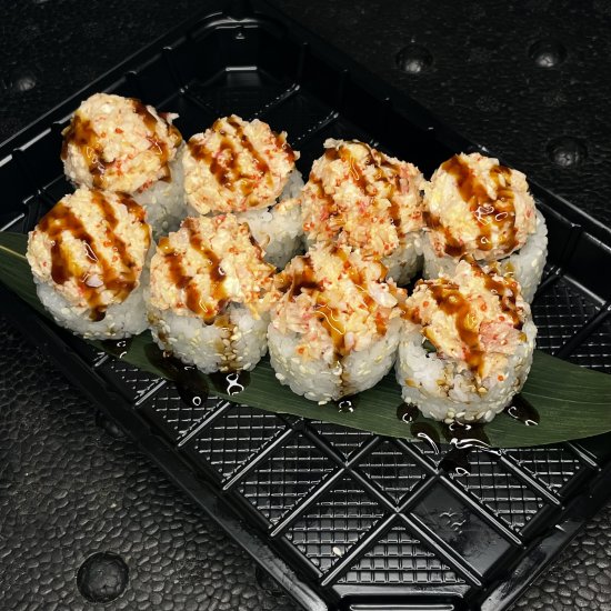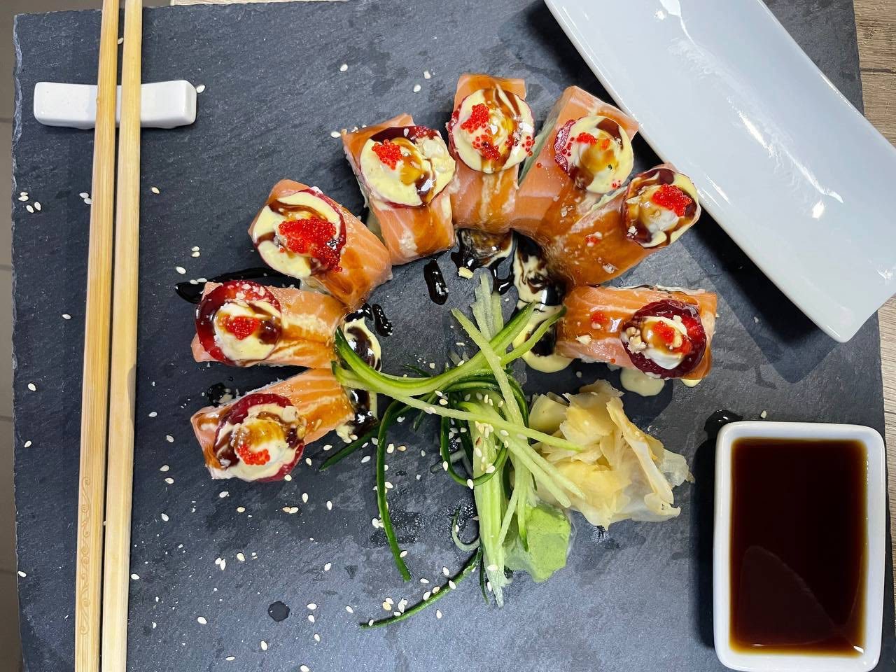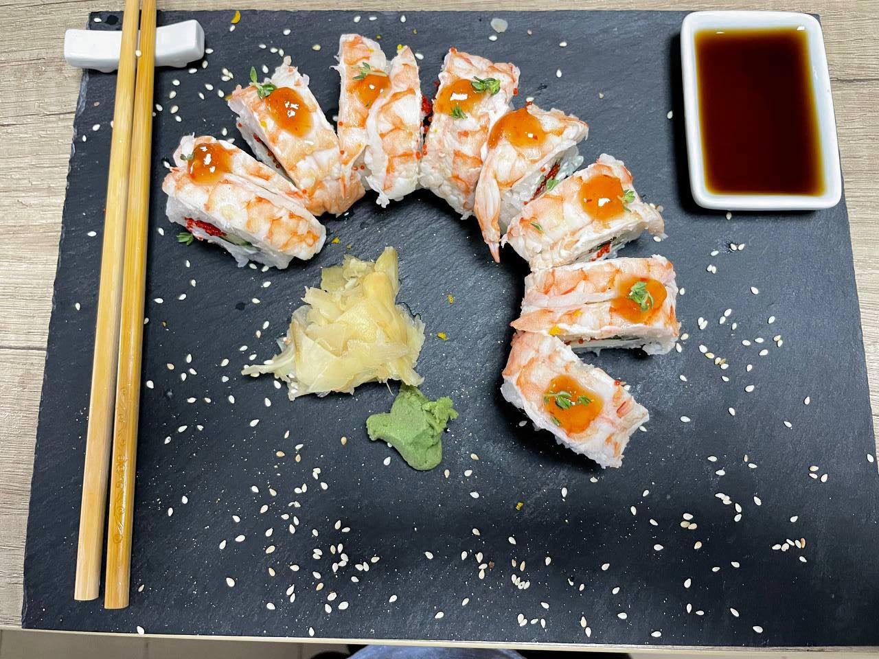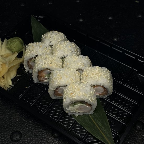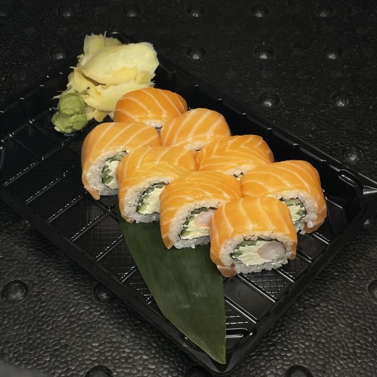 Рис, норі, крем сир, огірок, тобіко, креветка, соус світ чілі, цедраапельсина Вага: 300гр