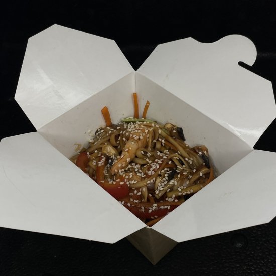 Лапша, Морква, Перець, Цибуля, Цукіні, Шампіньйони, Унагі, Тереякі, Соєвий соус, Кунжут, Курка/Криветка(на вибір)