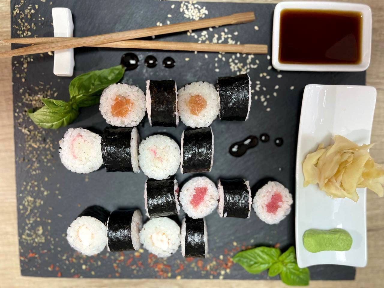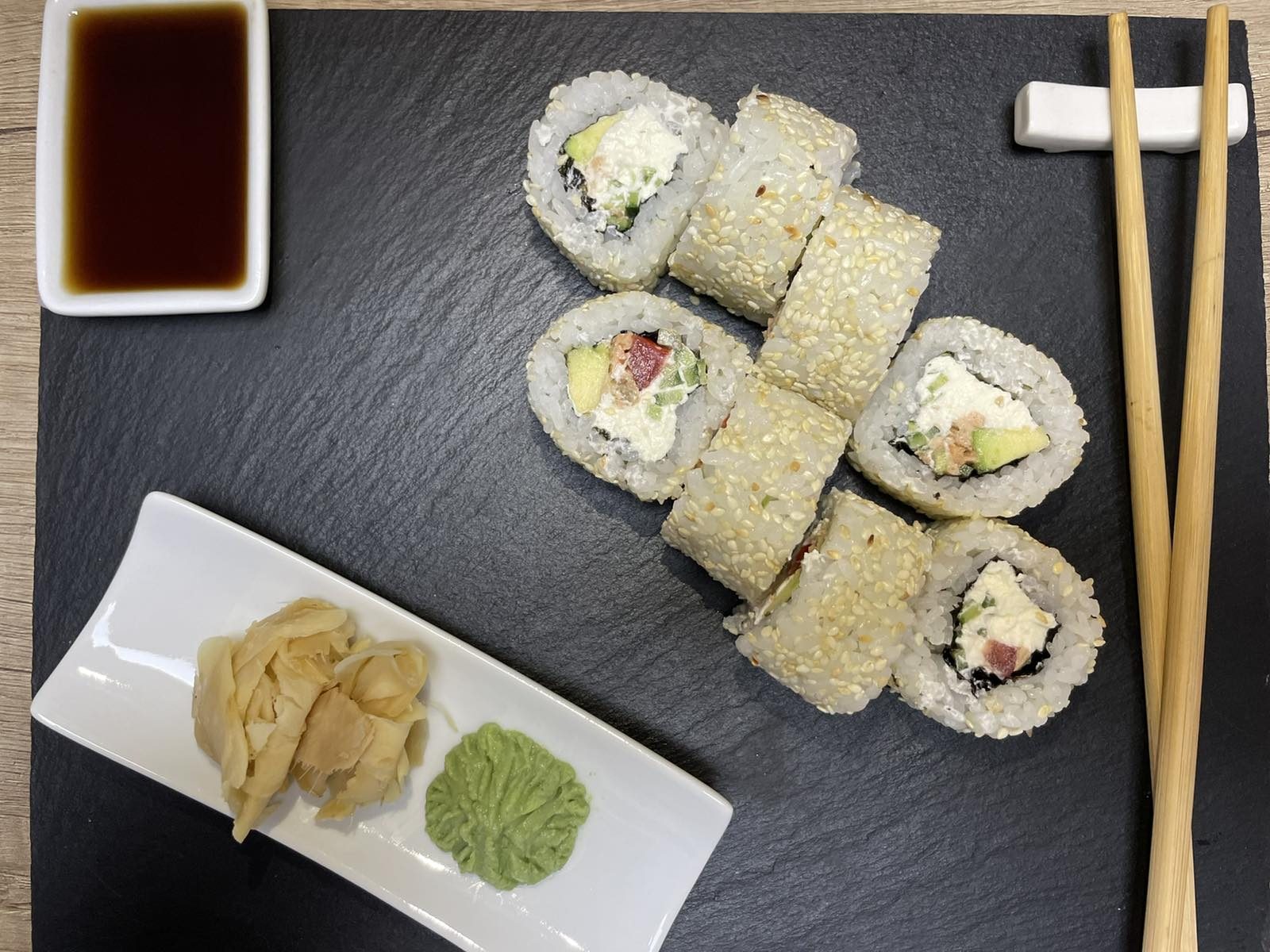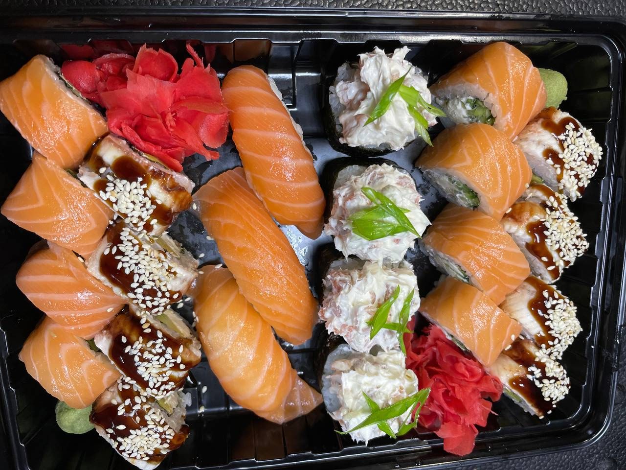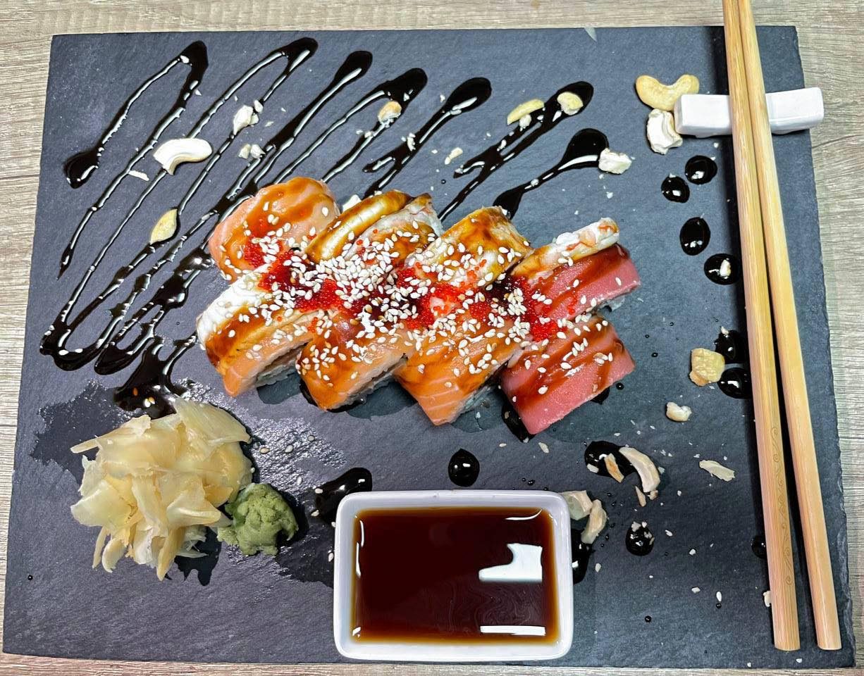 Рис, норі, крем сир, лосось, вугорь, тунець, огірок, конжут, зелена цибіля Вага: 240гр